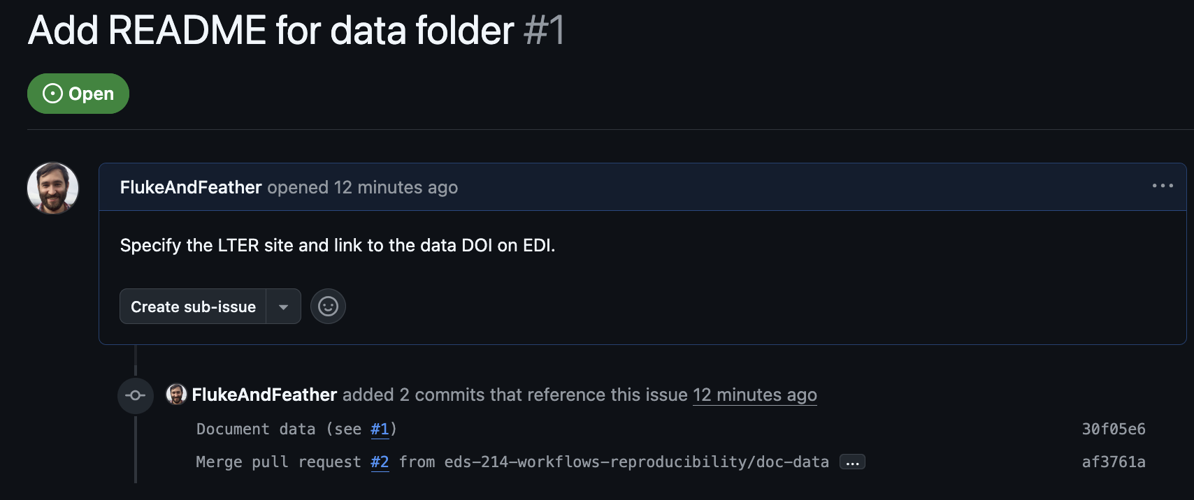 Switch back to the Issue you made earlier. You should now see 2 commits that reference the issue: the commit you made locally and the pull request itself. Close the issue by clicking the Close issue button with the purple check mark next to it.