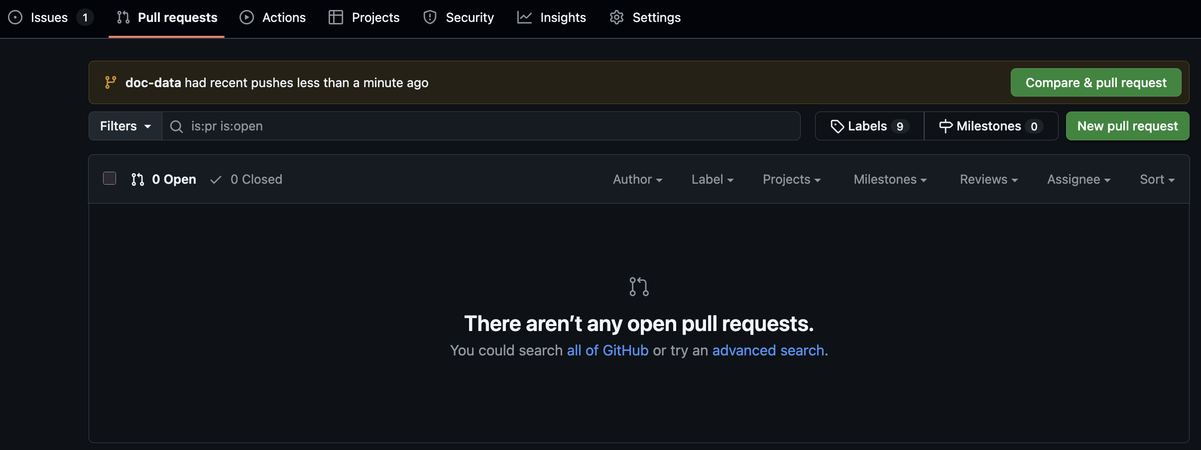 - Navigate to your repo on GitHub. Switch to the Pull requests tab. You should see a yellow notification that one of your branches had a recent push, and a green button saying Compare & pull request. Click on that green button (not New pull request).