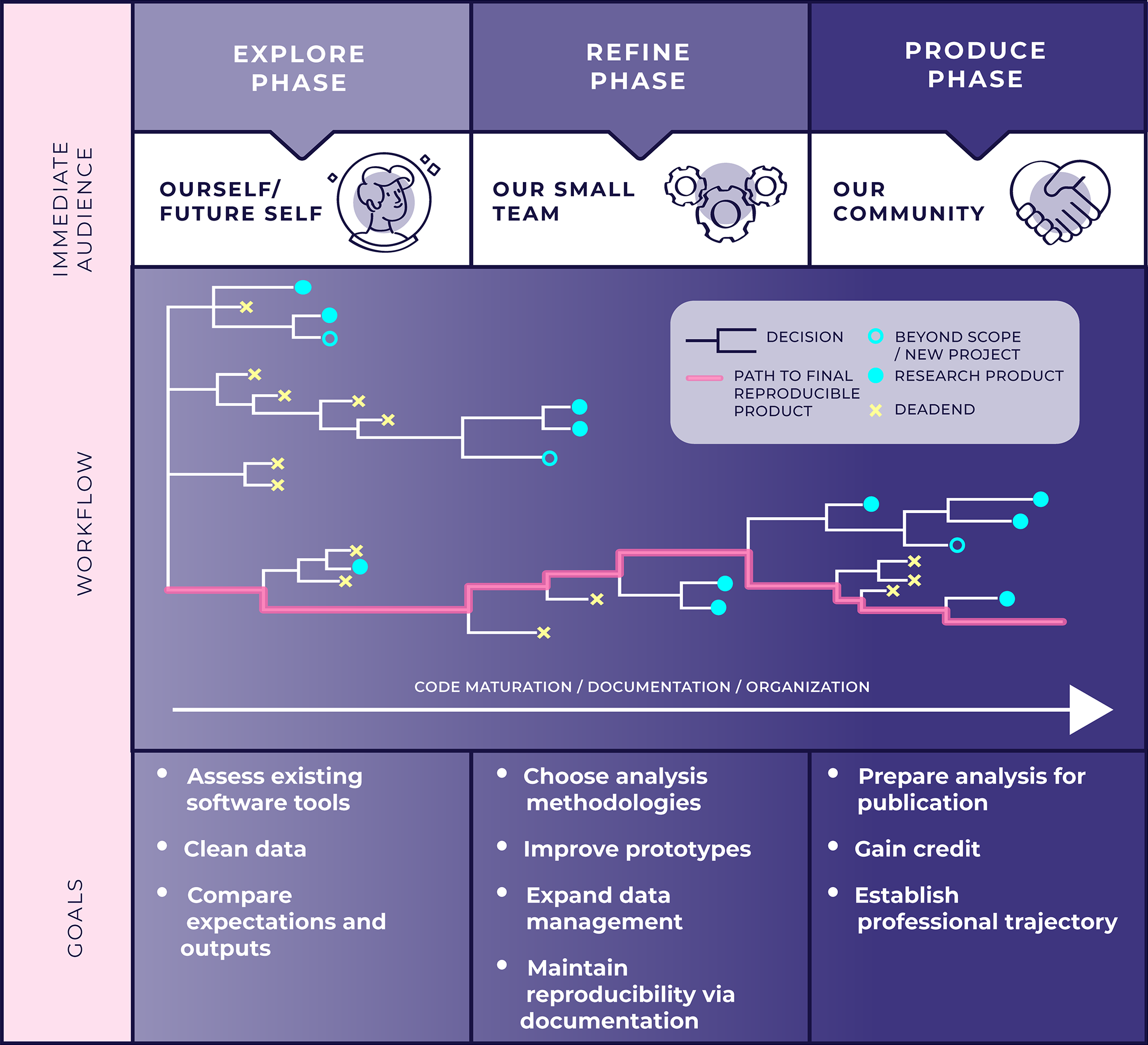 In most analyses, you won’t know exactly what you need to do fully in advance. Which means your initial implementation is going to be exploratory. Recall the figure below from Day 1 (Stoudt, Vásquez, and Martinez 2021). As you draft your code, you’ll hit dead ends or pivot to new solutions. These dead ends yield confusing code that’s hard to read and build upon. This problem is inevitable! Refactoring is the solution.