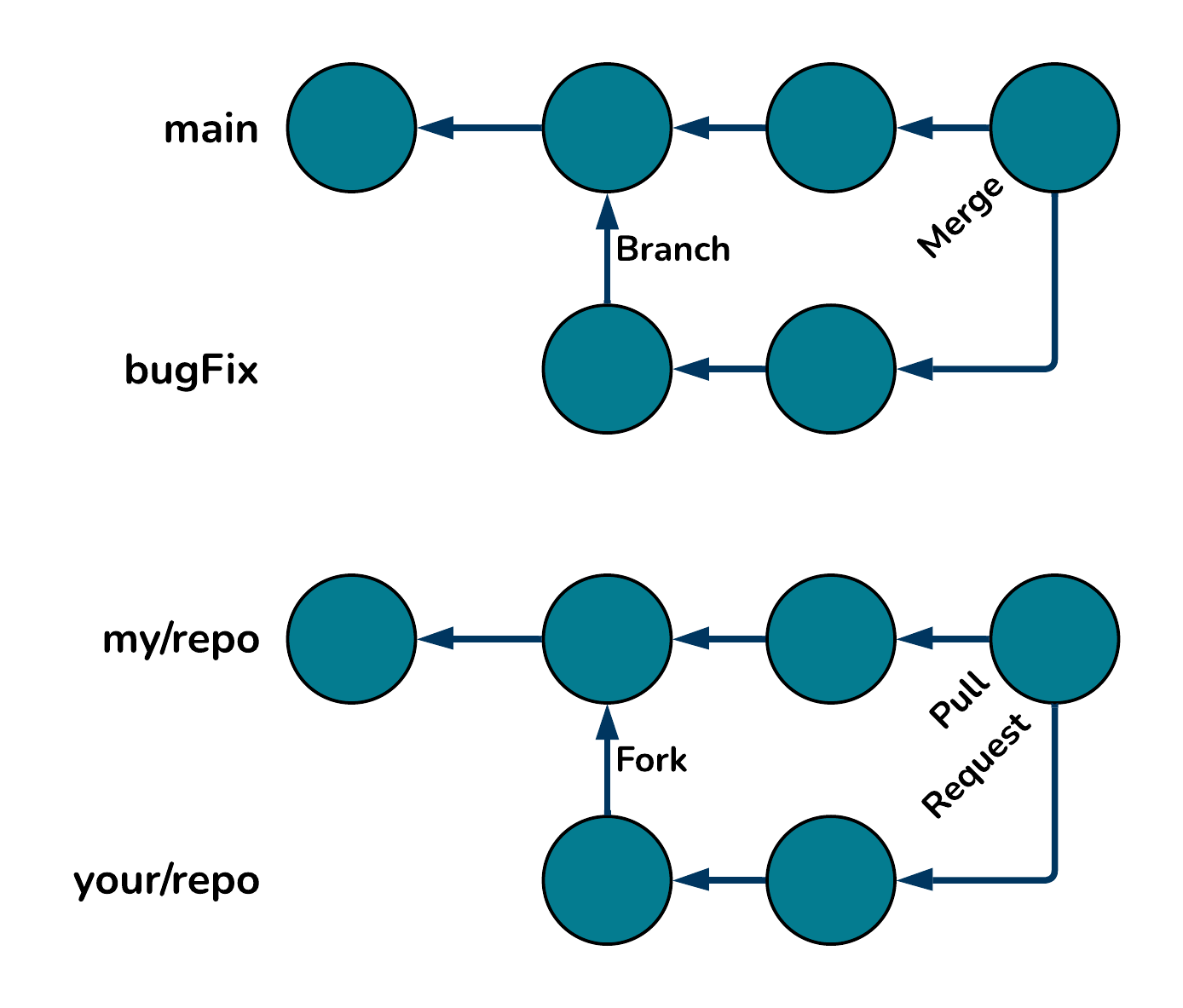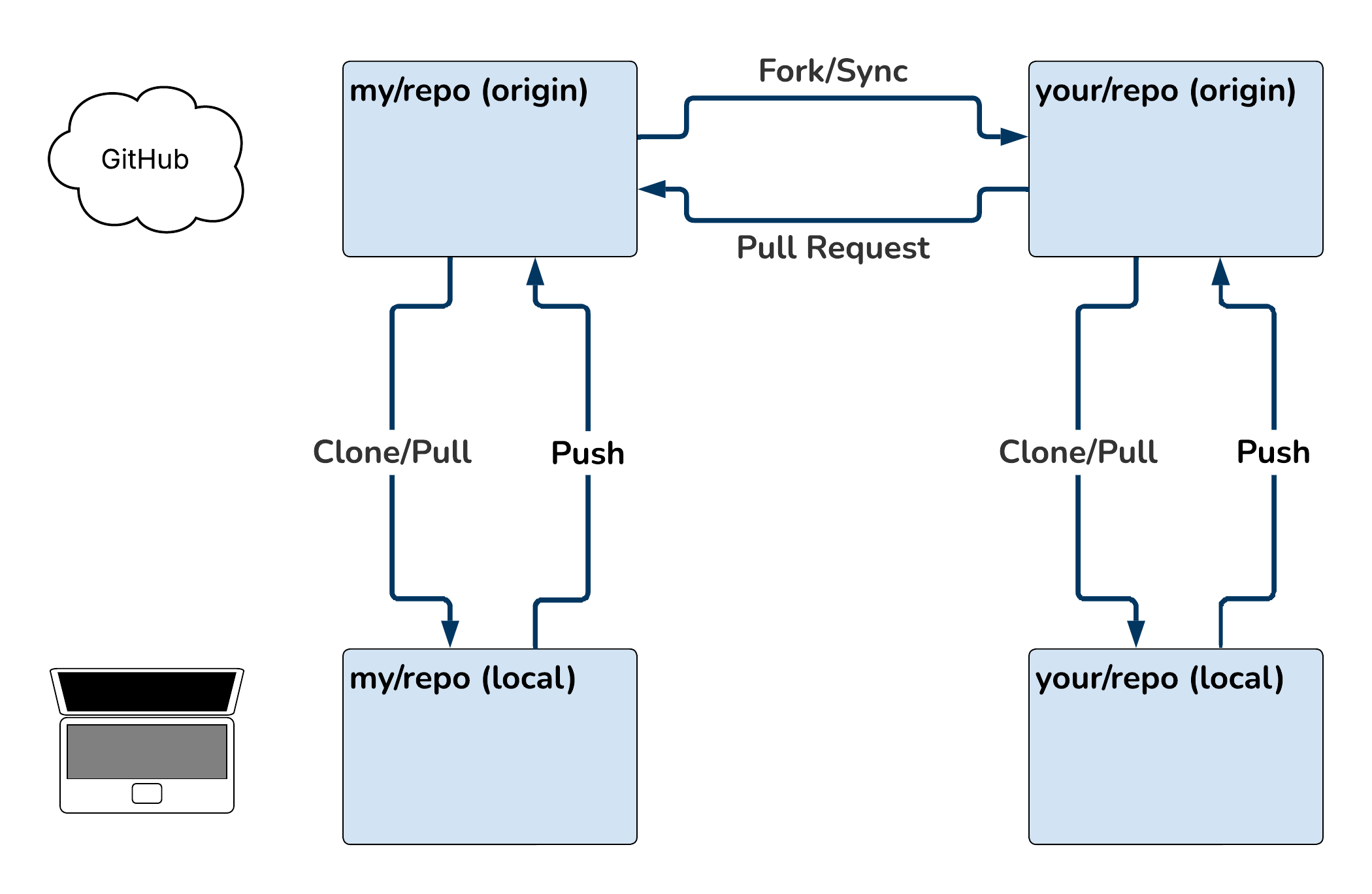 The connection between local and remote fork mirrors the local and remote original..