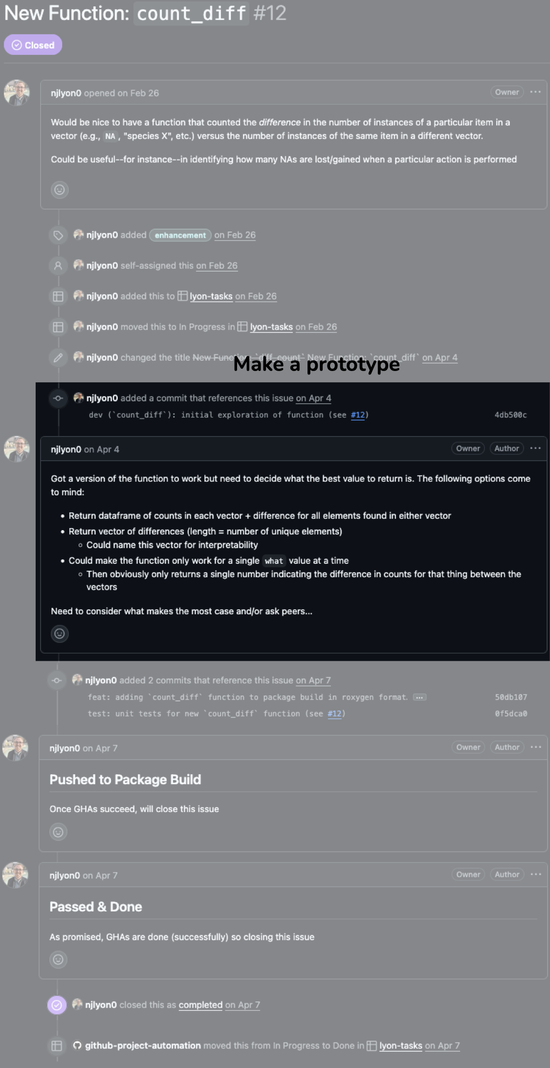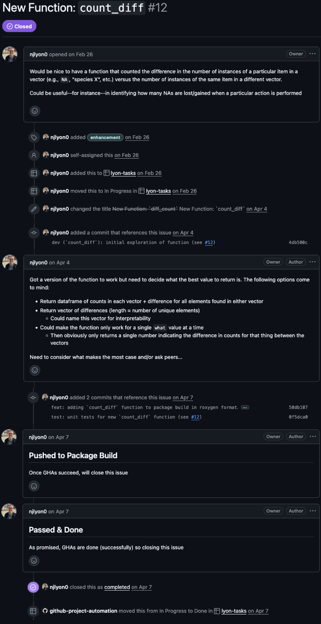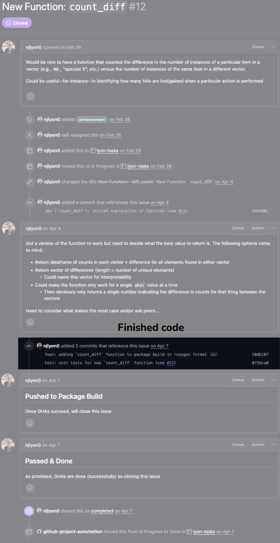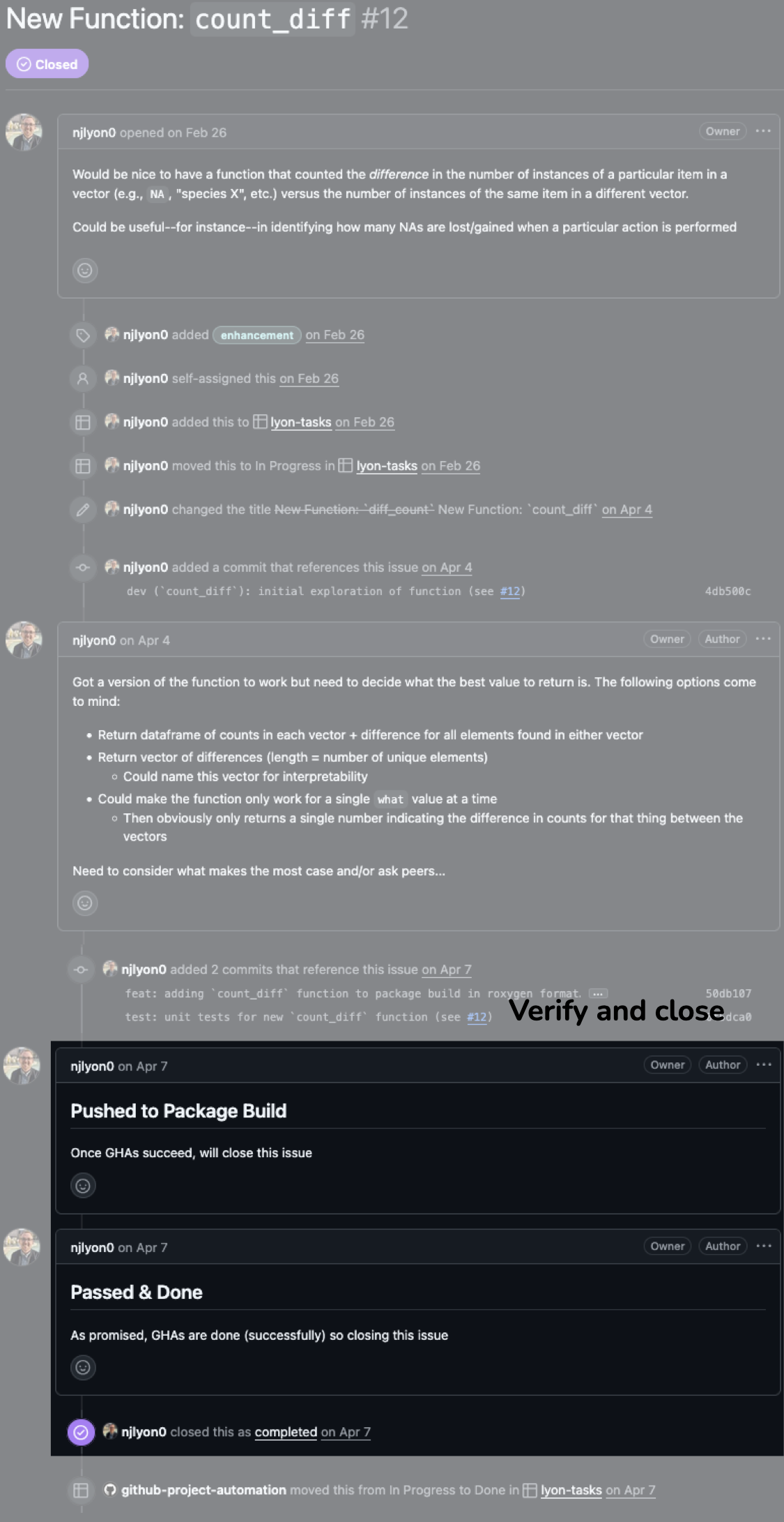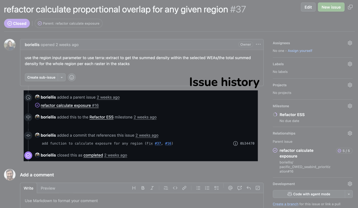 She manages her project in a GitHub repository, using Issues to track tasks and Pages to share her results with collaborators.